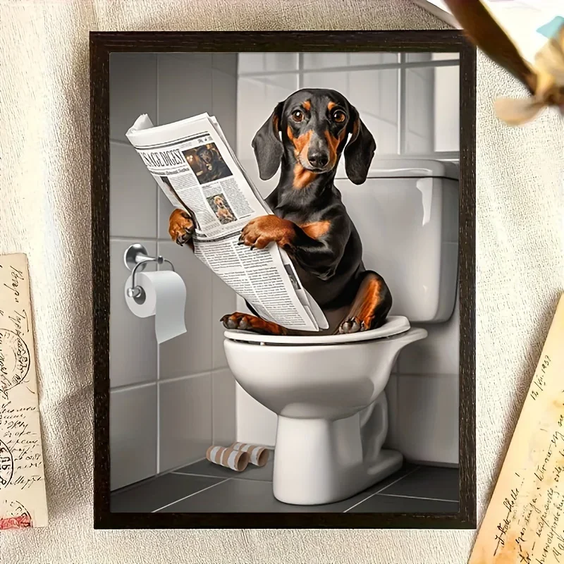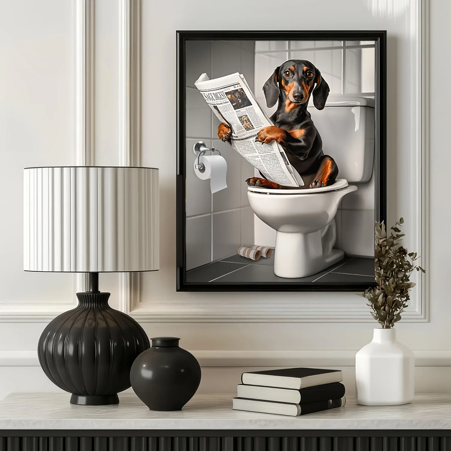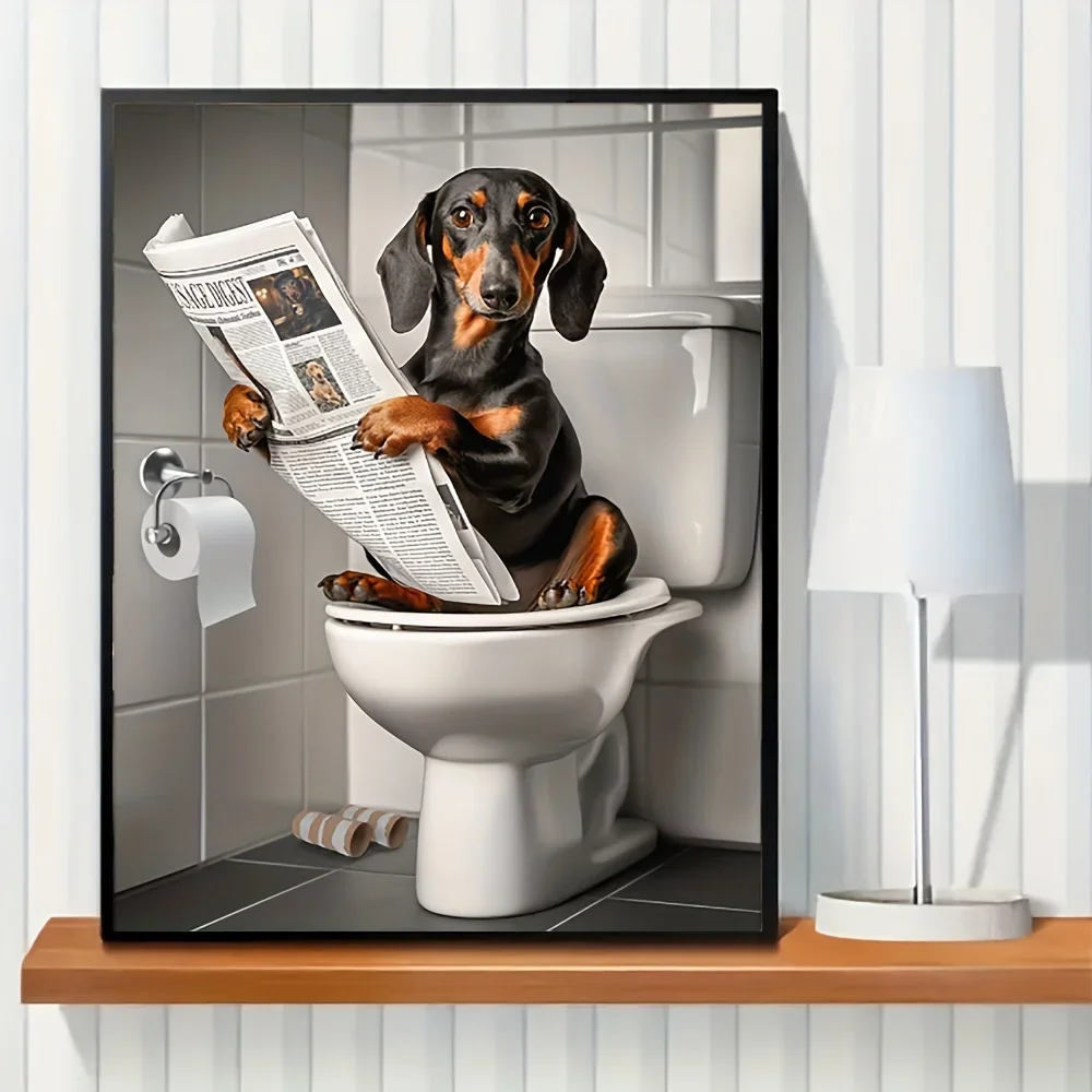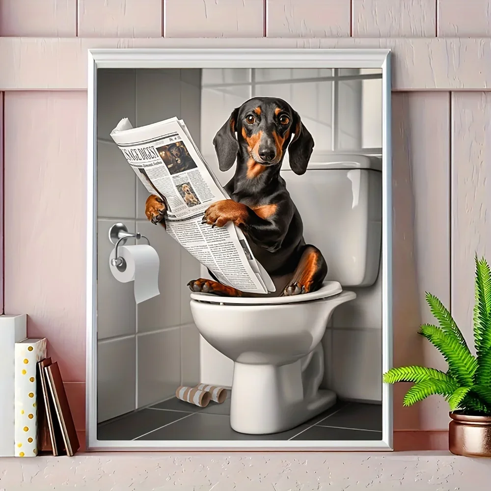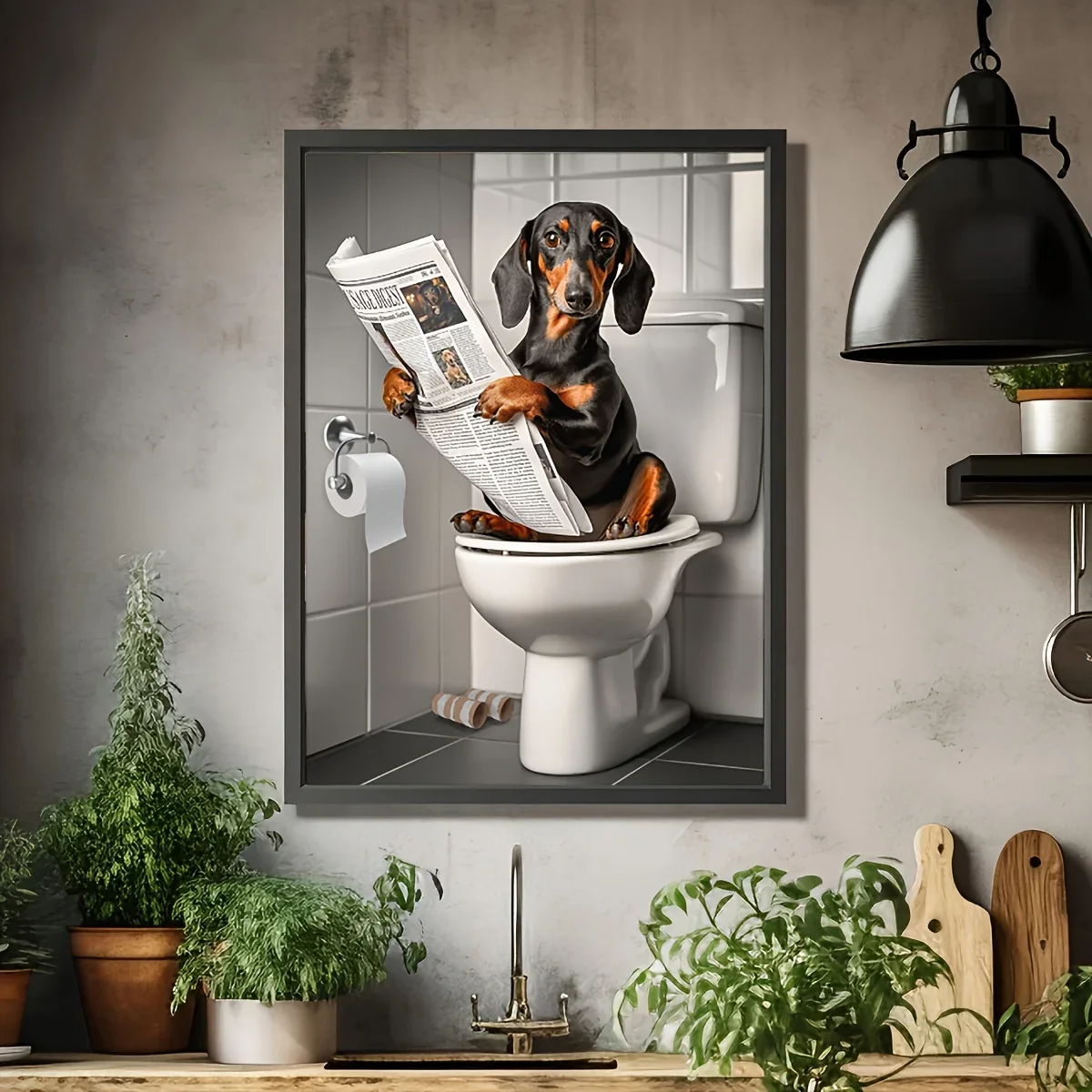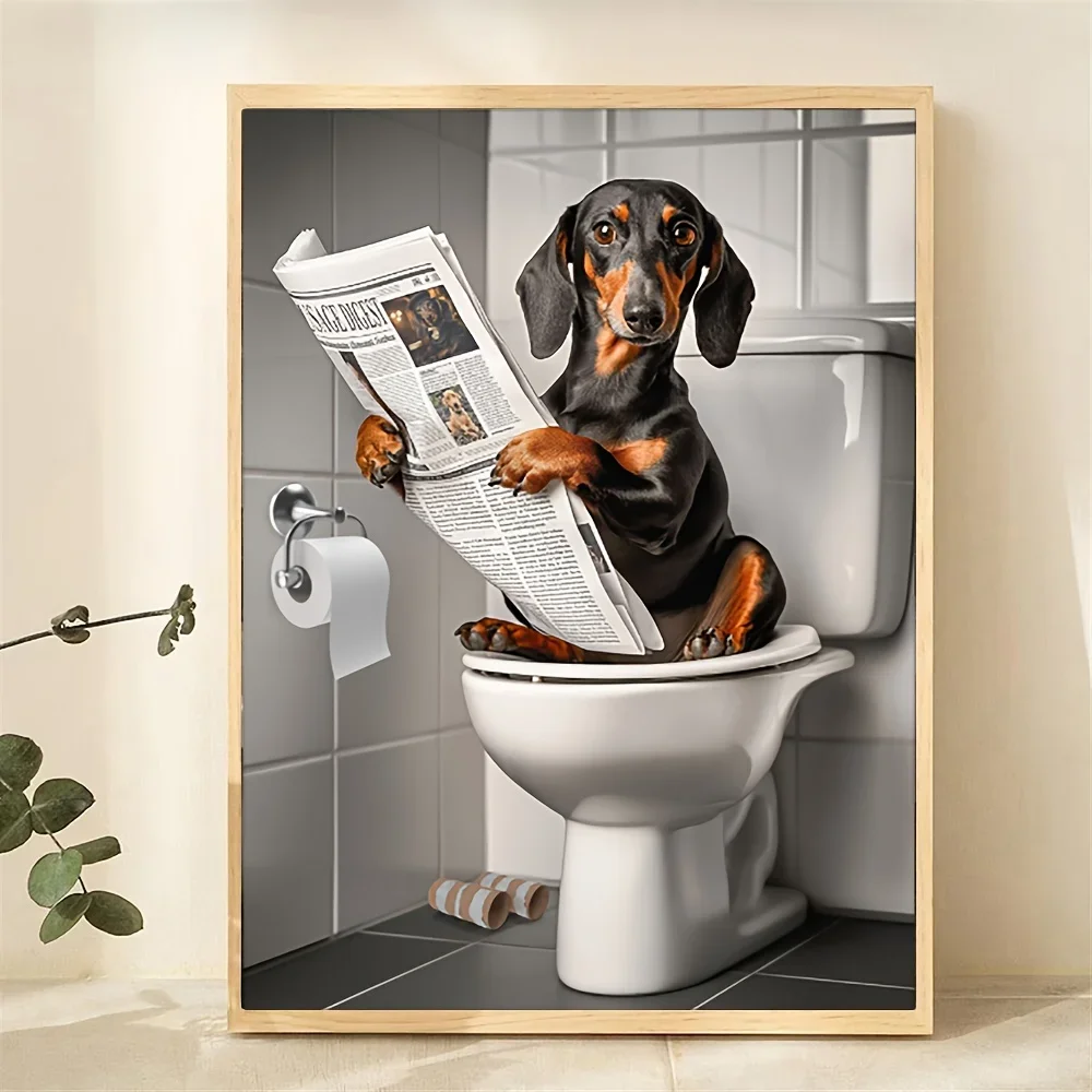 1pc Playful Dachshund on Toilet Canvas Print Wall Art for Pet Lovers,for Home Decor Bedroom,Kitchen,Living Room,Bathroom, Hotel